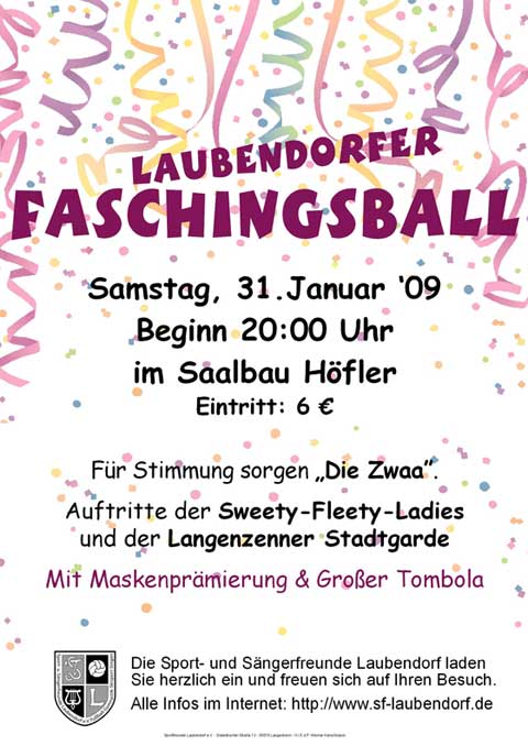 Nachdem im Jahr 2008, aufgrund unserer Feierlichkeiten zum 50-jährigen Jubiläum, kein Faschingsball im Saalbau Höfler stattgefunden hat, können sich nun alle Faschingsfans wieder auf die traditionelle Veranstaltung freuen.Hat den schon jeder seine Verkleidung gebastelt ?Natürlich findet auch in diesem Jahr wieder eine Maskenprämierung statt.