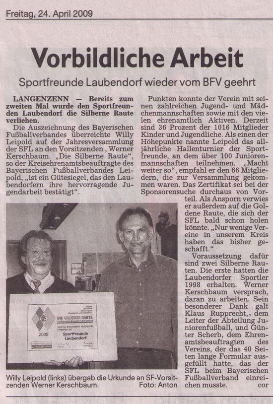Am heutigen Freitag schrieben die Fürther Nachrichten über die Vergabe der 2ten silbernen Raute für die Sportfreunde Laubendorf.