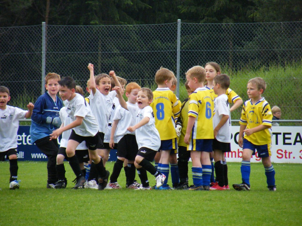 Die Kids des Jahrganges 2002 forderten des öfteren Szenenapplaus der Zuschauer heraus. Was die Kinder, die zum 1. Mal über 2 x 20 Minuten ran mussten, zeigten, war aller Ehren wert. Optisch und spielerisch waren die Kleeblätter überlegen, doch mit tollen Kampfgeist und einem überragenden Torwart Robert Masson hielten unsere Jungs die Niederlage mit 1:3 (1:1) in Grenzen. Schütze des viel umjubelten Ausgleichstoren war John-Paul Förster. Auch in traditionell anschließenden Siebenmterschießen gewann die SpVgg mit 8:6.