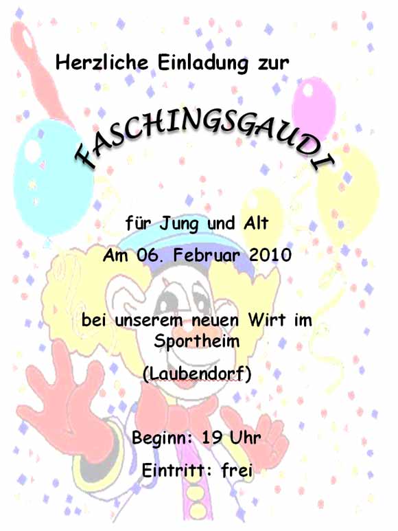 Februar findet unser alljährlicher Faschingsball statt. DieSportfreunde laden alle Faschingsbegeisterte und die, die sich nochbegeistern lassen wollen, in die neu eröffnete Griechisch Essen in Langenzenn griechische Gaststätteins Sportheim Laubendorf ein. Ab 19 Uhr sind Tür und Tor für die Narrengeöffnet. Die Sportfreunde und Wirts-Familie Imam freuen sich auf eurenBesuch.