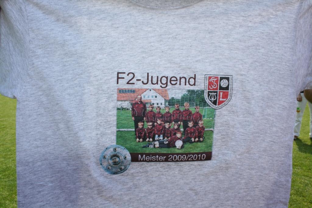 Die Meistermannschaft der F2 (Jahrgang 2002) mit Trainer Klaus Schneider. Das steht auf den Meister T-Shirts, die unmittelbar nach dem 10:1 Kantersieg gegen Scheinfeld überreicht wurden.