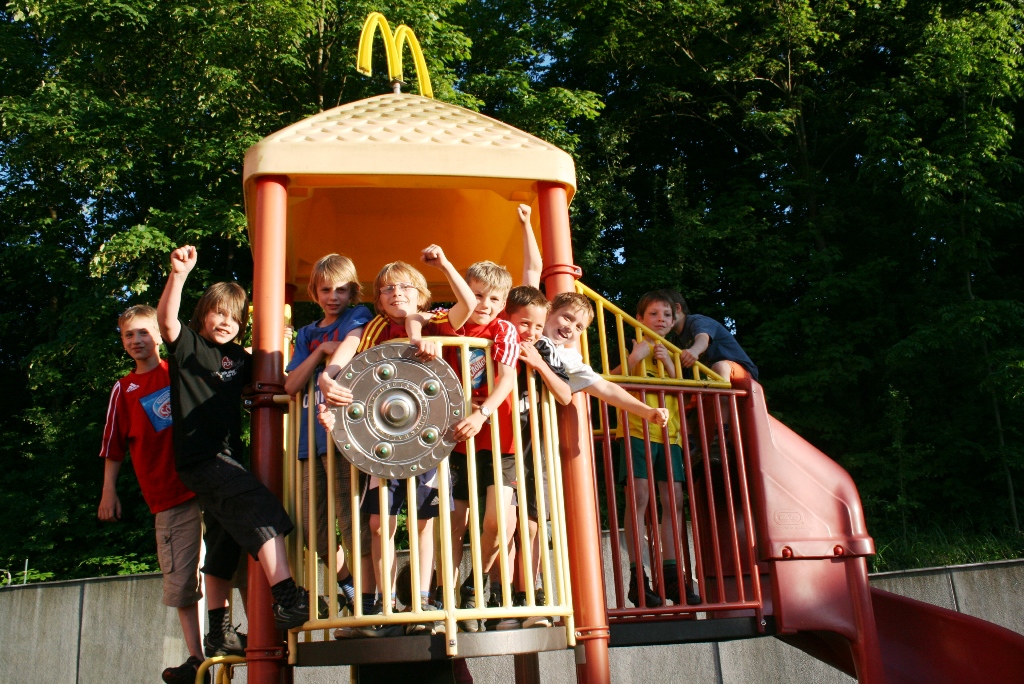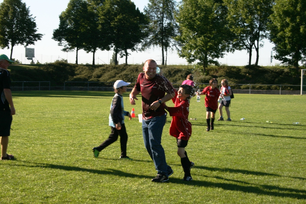 Hier ist das Ding! Chefcouch Klaus bei der obligatorischen Dusche Mac Donald durfte sich über den Besuch einer hungrigen Truppe freuen.