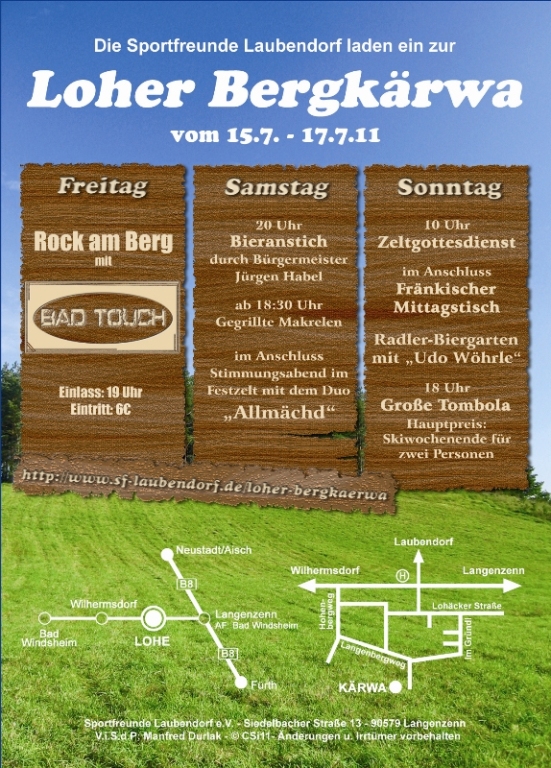 "Der Berg ruft" heißt es wieder am Wochenende vom 15-17.Juli. Die Loher Bergkärwa startet am Freitag mit einem Rockabend für Jung und Alt undder Gruppe Bad Touch. Besonders freuen wir uns, dass wir am Samstagabenddas TrioAllmächd auch für die Loher Bergkärwa gewinnen konnten, nachdem sie bereits am Frühschoppen für tolle Stimmung sorgten. Als Neuerung bereiten wir für alle Gäste eine Auswahl anleckeren Cocktails in unserer neu ins Leben gerufenenen Cocktail-bar. Außerdem gibt es am Samstag ab 18:30Uhr gegrillte Makrelen. Der Sonntag beginnt mit dem bewährten Gottesdienst um 10 Uhr (Vorsicht, veränderte Zeit im Vergleich zum Vorjahr) und einem reichhaltigen Mittagstisch im Anschluss.Die Loher Bergkäraendet mit der großen Tombola um 18 Uhr (auf Wunsch unserer Gäste in diesem Jahr etwas früher als gewohnt). Das komplette Programm finden sie im Anhang. Die Sport- und Sängerfreunde heißen Sie herzlich Willkommen.