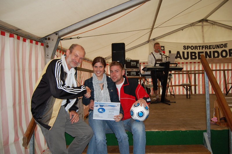 Am Freitagabend waren gut 500 meist jugendliche Besucher gekommen um erneut den Sound von "bad touch" zu genießen. Der Samstag war dann eher dem älteren Publikum gewidmet und begann mit dem tradionellen Bieranstich durch Bürgermeister Jürgen Habel unterstützt von Brauereichef Hofmann. Gestärkt durch Makrelen oder anderen Leckereien vom Grill wurde kräftig geschunkelt und mitgesungen, als das erstmals verpflichtete Trio "Allmächd" für beste Stimmung sorgte. Dabei auch wieder eine stimmungsvolle Gruppe der "Camper vom Eichensee". Ein Kölner unter ihnen verstärkte kurzzeitig die Musik und brachte das "via colognia" stilecht unter die begeisterte Menge. Am Sonntagmorgen fand der Zeltgottesdienst, umrahmt von Posaunenchor und Sängerfreunden Laubendorf, regen Zuspruch. Danach war "Bratenzeit" im Festzelt angesagt, wo sich nicht nur die Gottesdienstbesucher die schmackhaften Angebote mit frischen Klößen und Salat munden ließen. Der Nachmittag wurde dann leider vom Dauerregen beeinträchtigt. Trotzdem waren viele Besucher anwesend als erneut drei Juniorenmannschaften für ihre errungenen Meisterschaften geehrt werden konnten. Als guter Zeitpunkt erwies sich die auf 18 Uhr vorverlegte Verlosung der Tombola mit 37 ! Preisen, wo viel mehr Besucher anwesend waren als in den Jahren zuvor. der 1. Preis,ein Gutschein für ein Skiwochenende, ging an Sabine Blank aus Meiersberg. Ein Sonderlob haben sich die rund 100 Helferinnen und Helfer aus den Reihen der Sport- und Sängerfreunde verdient, die für das rundum gelungene Fest gesorgt haben. Manfred Durlak 2.Vorstand PS: Ein großes Dankeschön an unsere fleißigen Skiclub-Mädels, die am Samstag im Dirndl bedient haben!