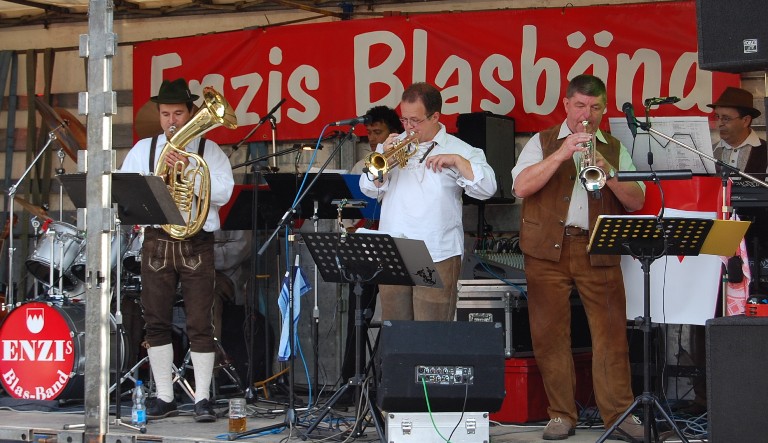 Weinverkäuferinnen Enzis Blasband gute Stimmung mit viel Tanz auf der Bühne