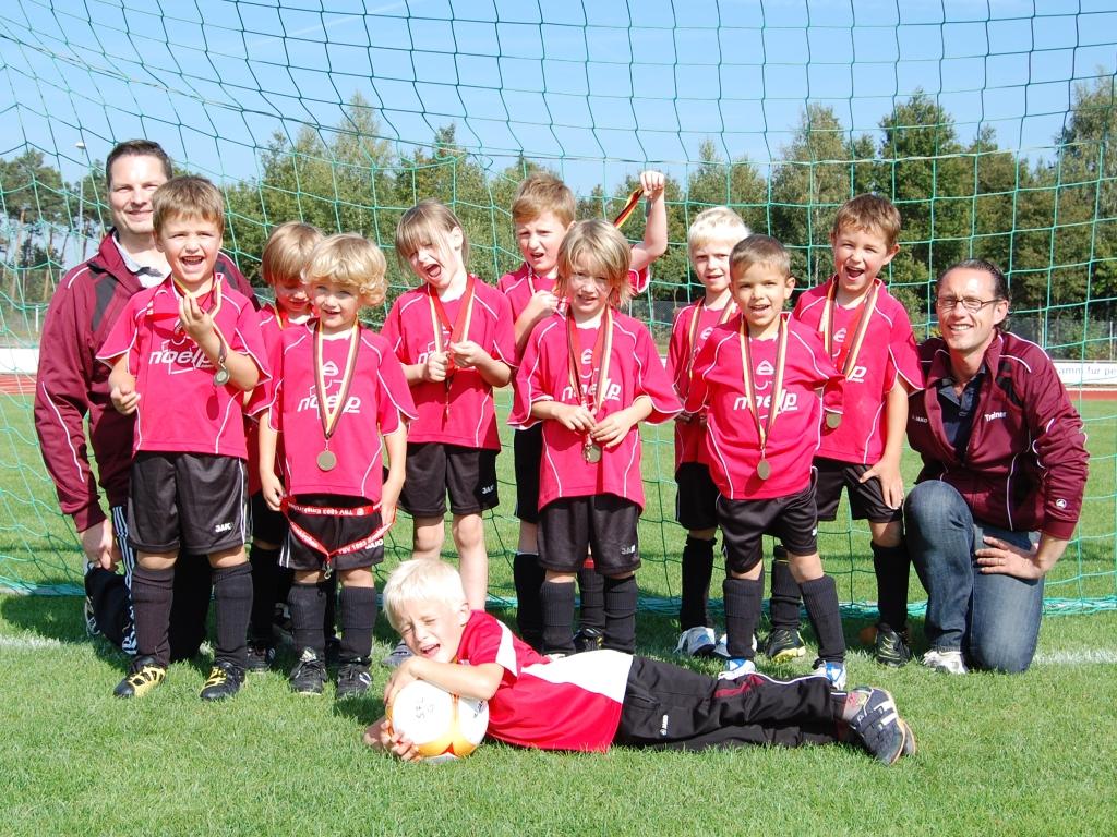 Im Konvoi fahren wir zum TSV Emskirchen und treffen zeitgleich mit der Truppe des SV Burggrafenhof ein. Hansi Kamm erzählt uns auf dem Weg zur Kabine, dass er ersatzgeschwächt nur mit 6 Kindern aufwarten kann. Unsere Mannschaft wird durch 3 weitere Spieler vervollständigt. Der TSV Wilhermsdorf erscheint heute gar nicht, somit werden die Spiele jeweils mit 3:0 für den Gegner gewertet. Ein Spiel haben wir also schon mal in der Tasche – die anderen aber leider auch. Wir begegnen im ersten Spiel der G1 des TSV Emskirchen. Die Gegner beginnen auch sofort Druck auf unser Tor auszuüben, aber unsere Abwehr steht hervorragend. Leider ist gleich in den ersten Minuten ein Glückstreffer für den TSV Emskirchen im Tor, was unsere Kinder aber eher anstachelt als niederschlägt. Ab diesem Zeitpunkt gibt es keine wirklich gefährliche Szene mehr vor unserem Tor, entweder kommen die Gegner gar nicht mehr in die Nähe des Strafraums oder werden von der Abwehr gestoppt. Und auch unser neuer Torwart Niklas zeigt noch ein paar gute Paraden. Nach vorne wird der Druck größer, aber leider gelingt uns nicht mehr der Ausgleich. Als nächstes spielt der SV Burggrafenhof gegen die G2 des TSV Emskirchen und legt mit 9:0 einen guten Start hin. Nach einer Pause wird der SV Burggrafenhof von der G1 des TSV Emskirchen mit 2:1 besiegt. In unserem zweiten Spiel treffen wir auf die G2 des TSV Emskirchen, die das ganze Spiel nur wenige Male in unsere Spielfeldhälfte hineinkommen. Fast jeder unserer Spieler hat das Tor auf dem Schlappen, als Torschützen reihen sich aber leider nur Tim mit 3 Treffern und Calvin mit 2 Treffern ein. Annika, die heute ihre gute Leistung aus den letzten Trainings fortsetzt, Corbinian, Elias, Jonas, Lewin und Téo haben alle gute Chancen, aber wie durch Zauberhand ist entweder ein Fuß oder Pfosten im Weg oder das Tor istnicht breit genug. Auch Nils, der erst heute eingesprungen ist (danke nochmals an Micha und Bernd) spielt befreit auf. Es bleibt beim 5:0; Alle, Kinder, Zuschauer, Olli und ich freuen uns. Nach kurzer Pause sind wir gleich wieder dran, gegen unseren Nachbar vom TSV Burggrafenhof. Annika, Calvin und Elias gehen auf Manndeckung zu Basti und Anton. Diese haben dadurch nicht besonders viel Freiraum und können nicht so spielen wie gegen die G2 vom TSV Emskirchen. Leider schafft es doch ein Ball bei uns ins Tor, aber auch wir haben einige tolle Chancen und vor allem tolle Spielzüge. Bälle werden von der Seite oder von hinten vors Tor geschossen und oft steht dort auch einer unserer Spieler. Aber leider auch immer einer der Gegner. Auch dieses Spiel müssen wir mit 1:0 abgeben, aber die Kinder und vor allem Olli und ich sind begeistert von der Spielfreude und den knappen Ergebnissen. Im letzten Spiel des Tages spielen die beiden Mannschaften des Gastgebers TSV Emskirchen, welches die G1 mit 5:0 für sich entscheidet. Wir haben unser erstes Turnier gleich mit einem positiven Torverhältnis abgeschlossen und freuen uns auf das nächste in zwei Wochen (08.10.) beim SV Burggrafenhof.