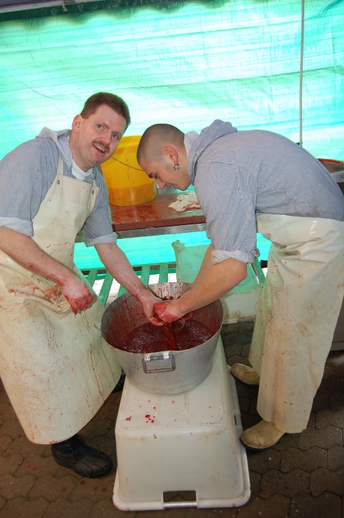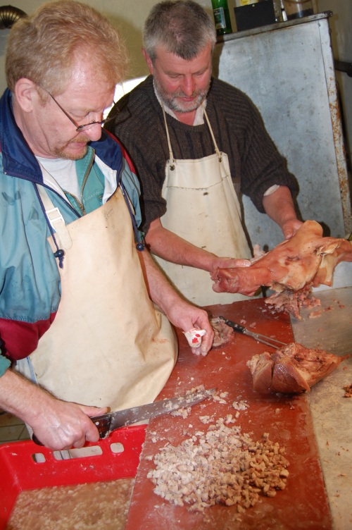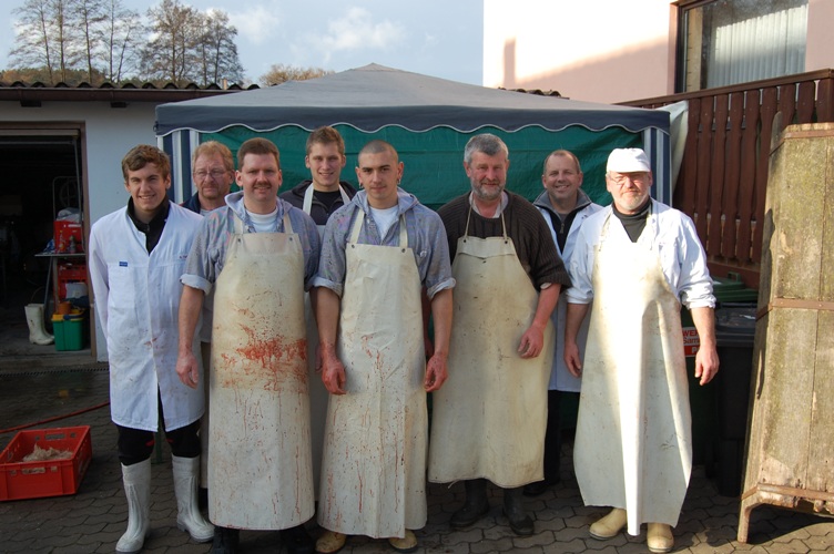 Wie jedes Jahr findet der nicht unblutige Akt im Hause Tiefel statt, wofür wir Heike und Gerhard sehr dankbar sind. Metzger und Helfer haben sich auch heute wieder am frühen Morgen eingefunden um aus einer stattlichen Sau eine Reihe von wohlschmeckenden Fleisch- und Wurstangeboten zu fertigen. Dazu ist auch viel Feinarbeit notwendig, wobei man den scharfen Messern nicht zu nahe kommen sollte um weitere „Blutopfer“ zu vermeiden! In der kommenden Woche werden die meisten Teile noch einer Räucherung unterzogen, bevor sie am nächsten Sonntag in unserem Stand in der Rosenstraße auch probiert und käuflich erworben werden können. Viele Stammkunden sorgen im Normalfall dafür, dass die Wurstwaren meist weit vor Ende des Weihnachtsmarktes ausverkauft sind. Wir bedanken uns bei Christian Tiefel, Harald Täuber, Gerd Fischer, Nico Sand, einem unbekannten Helfer, Siggi Jakob, Walter Knoblich und Hausherr Gerhard Tiefel.
