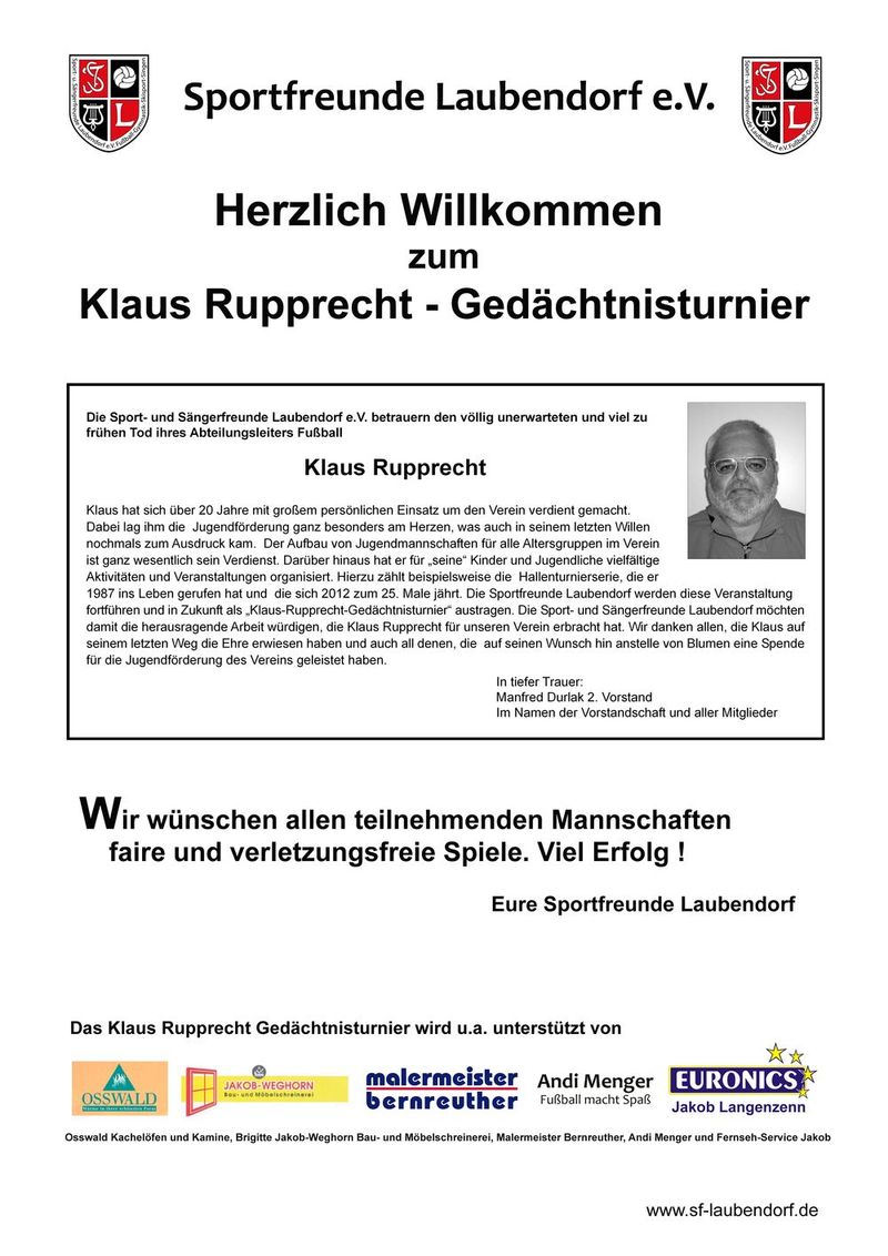 Über freiwillige helfende Hände würden wir uns sehr freuen. Direkt im Anschluß beginnt unser internes Turnier mit der 1&2ten Mannschaft, der AH und der A-Jugend SG. Das interne Turnier beginnt um 18 Uhr. Wir bitten alle Spieler möglichst um 17:15Uhr anwesend zu sein. Wer etwas später kommt kann aber immernoch einsteigen. Wir teilen uns wieder in "mixed Teams" ein, damit spannende Spiel garantiert sind. Alle weiteren Informationen inklusive denSpielplänenzu den jeweiligen Turnieren der G-,E-,F-, und D-Jugend, sowie zum Turnier der Damenmannschaft finden Sie hier. Wir wünschen allen Mannschaften faire und verletzungsfreie Spiele! Eure Sportfreunde Laubendorf