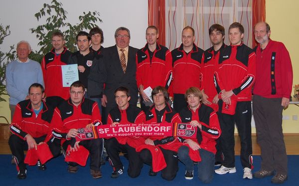 Mannschaft mit Coach Christian Gall ihre Ehrung für die Meisterschaft in der A-Klasse für die Saison 2010/2011. Martin Schneider wurde für seine Erfolge beim TSV Burgfarrnbach und für seine guten Leistungen in der Vorrunde beim SFL gleichermaßen ausgezeichnet. Wir freuen uns aber auch, dass andere Laubendorfer Ehrungen erfahren haben, wie Wolfgang Erhart im Tennisbereich, Holger Heidingsfelder für die Teilnahme am "Iron Man" auf Hawaii und sogar als "Sportler des Jahres" Felix Mahr mit besonderen Leistungen im Bogensport. Allen Geehrten gratulieren wie hiermit ganz herzlich, wünschen weiterhin Spaß und Erfolg bei ihren sportlichen Aktivitäten und würden uns freuen wenn auch in 2013 "Laubendorfer" bei der "Sportlerehrung 2012" der Stadt dabei sein könnten. Für die Vorstandschaft Manfred Durlak