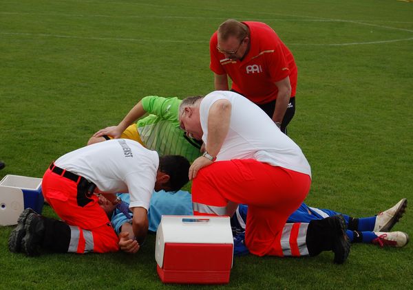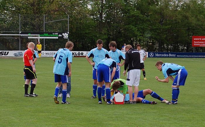 Spielminute der ersten Halbzeit in Neustadt als es die Gastgeber erneut mit einem langen Ball durch die Mitte versuchten. Aber wie schon mehrere Male vorher so war auch in diesem Fall mit Patrick Mitzler ein Laubendorfer schneller am Ball und wollte den Angriff abwehren als sich sein Gegenspieler deutlich sichtbar bei Ihm einhackte und beide zu Boden stürzten. Der nicht nur in dieser Szene unsichere Schiedsrichter ließ weiterspielen und erst die Zurufe mehrerer Spieler – auch vom TSV Neustadt-ließen ihn dann doch das Spiel unterbrechen. Dabei sah man sofort dass Patrick schwer gestürzt war und wohl auch noch das Gewicht des Gegenspielers auf den Arm gelastet hatte. Frank Hallwas war sofort zur Stelle und versuchte mit Eis und Wasser zu kühlen. Der Schiedsrichter schickte beide Mannschaften in die Halbzeitpause und wir riefen die Rettung. Diese war durch die Nähe zum Neustädter Krankenhaus rasch vor Ort versorgte Patrick und nahm ihn dorthin mit. Alex Pickl und Stephan Schmidt fuhren sofort ins Krankenhaus und blieben bis die halbe Mannschaft samt Trainer nach Spielschluss ebenfalls dort eintraf. Mit Erleichterung wurde die Nachricht aufgenommen dass es sich wohl doch um keinen Bruch sondern „nur“ um eine starke Prellung und Überdehnung des Ellenbogens handeln würde. Das soll jedoch in einer erneuten Untersuchung am Mittwoch abgeklärt werden. Wir waren froh, dass wir Patrick mit nach Hause nehmen durften.Wir wünschen Patrick gute Besserung und eine baldige Genesung.An dieser Stelle gilt es auch der Mannschaft ein deutliches Lob für ihre Geschlossenheit in der zweiten Halbzeit auszusprechen. Fielen schon vor dem Spiel mit Simon Porscha und Simon Kerschbaum zwei wichtige Verteidiger aus so kam nun auch noch Patrick dazu. Im Sturm fehlten weiterhin Martin Schneider und Johannes Keppner, dafür machten die eingewechselten Jugendspieler Lucca Horneber und Daniel Benkert ein prima Spiel. Die so veränderte Mannschaft kämpfte um jeden Ball und gewann deshalb absolut verdient.
