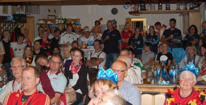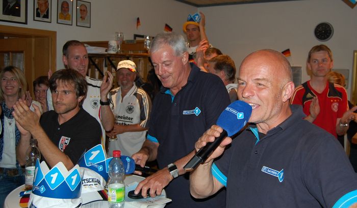 Diese Veranstaltung wird ohne jegliche Übertreibung in die jüngere Geschichte der Sport- und Sängerfreunde eingehen. Für Alle, die am Samstag nicht dabei sein konnten, hier ein Rückblick auf den letzten Samstag. Ab 14 Uhr 30 warteten wir auf das Team von B1 und als erstes kam das SAT-Mobil aus München an. Gegen 15 Uhr kamen dann die Helferinnen und Helfer dazu und sofort begann ein reges Treiben in und um das Sportheim. Es dauerte einige Stunden – unterbrochen durch den von uns bereitgestellten Kaffee und Kuchen- bis alle Leitungen standen, der Ton für Gastraum, Nebenzimmer und Terrasse abgestimmt und mit dem Funkhaus in München verbunden war. Dann kam zunächst Sportreporter Karl-Heinz Kas mit Begleitung an, wurde begrüßt und er kam sofort sehr sympathisch rüber. Kurz danach traf dann auch Stefan Lehmann ein, der den Bayern1-Hörern von seiner Nachmittagssendung und den Bayerfans als Sprecher von Bayern München natürlich bestens bekannt ist. Auch er sofort freundlich und sympathisch im Auftreten und umringt von vielen der vorhandenen Mitglieder. Seine erste Liveschaltung ins Programm machte er vom Biergarten aus, umringt von fachkundigen Laubendorfern. Ihm war es auch vorbehalten das extra bereitgestellte 20-Liter-Fass mit Kulmbacher Pils anzuzapfen, was ihm unter Beobachtung des 1. und 2. Bürgermeisters mit einem Schlag prompt gelang. Danach stand das kalte Buffet im Mittelpunkt und wer sich nicht rechtzeitig anstellte bekam nur noch Reste ab. Gegen 20 Uhr wurden alle Besucher auf die Plätze gebeten um die erste Übertragung aus dem Gastraum vorzubereiten. Dazu wurden einige Jubelvariationen geprobt, die dann auch gut funktionierten. Zu Spielbeginn wurden die Aufstellungen verlesen und dann sangen wir im Stehen die deutsche Nationalhymne, ein durchaus emotionaler Moment. Karl-Heinz und Stefan gaben dann immer wieder Kostproben ihrer Kommentatorenkunst ab und hielten alle drei Räume bei bester Laune. Das Bier lief besser als das deutsche Spiel und als es in der 2. Halbzeit mal wieder recht ruhig war da wurde „ ein prosit der Gemütlichkeit“ angestimmt und mittenhinein erzielte Mario Gomez das lang ersehnte 1:0. Danach war Stefan Lehmann in seinem Element, wie schon oft in der Allianzarena rief er den Torschützen auf und der vielstimmige Chor antwortete entsprechend. Nach Spielschluss fand nochmals eine Liveschaltung ins Funkhaus und ins Programm statt, dabei konnte ich mich für den tollen Abend bei Bayern1 bedanken. Dann wurde Allen vom Team Bayern1 Erinnerungen an die SFL übergeben.Während Stefan Lehmann danach bereitwillig Autogramme schrieb zog es Karl-Heinz Kas nach getaner Arbeit an die Theke, wo er mit den Fans diskutierte und konsumierte. Alle waren und sind sich einig, das war das Highlight des Jahres 2012 für die Sportfreunde. Vielen Dank sagen wir den zahlreichen Helferinnen und Helfern die das großartige Fest tatkräftig unterstützt haben. Mit besten Grüßen Manfred Durlak P.S. In den nächsten Tagen werden wir die vielen Bilder auswerten und ins Fotoalbum einstellen