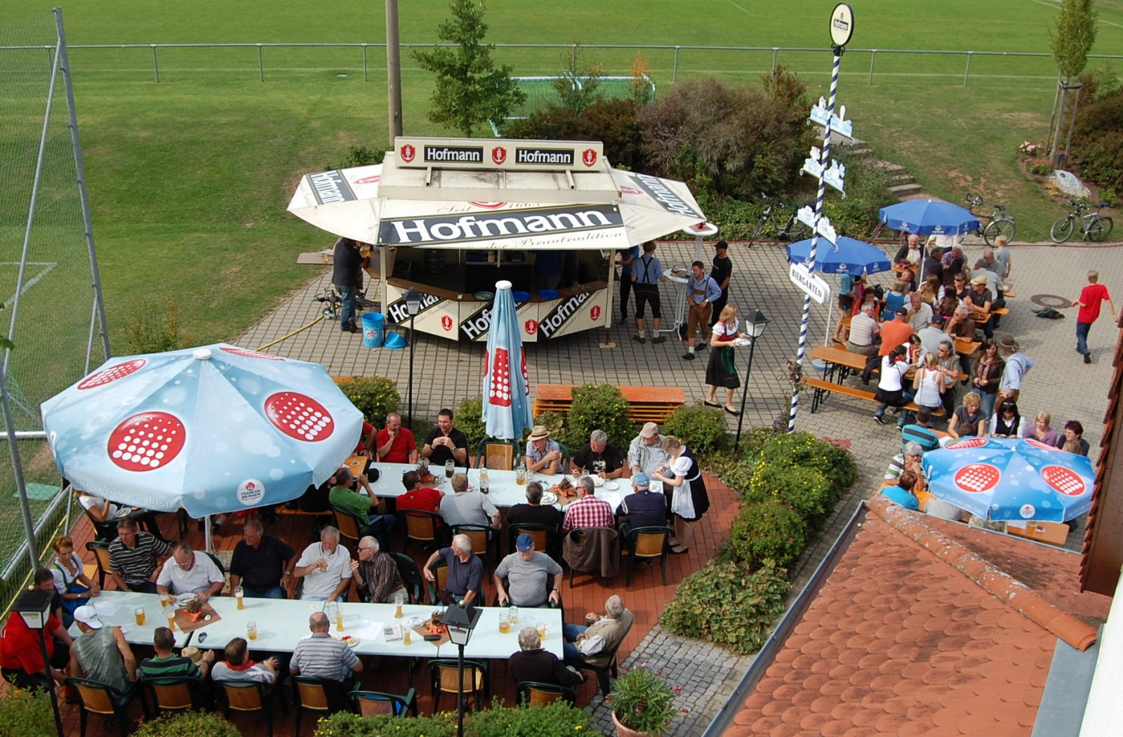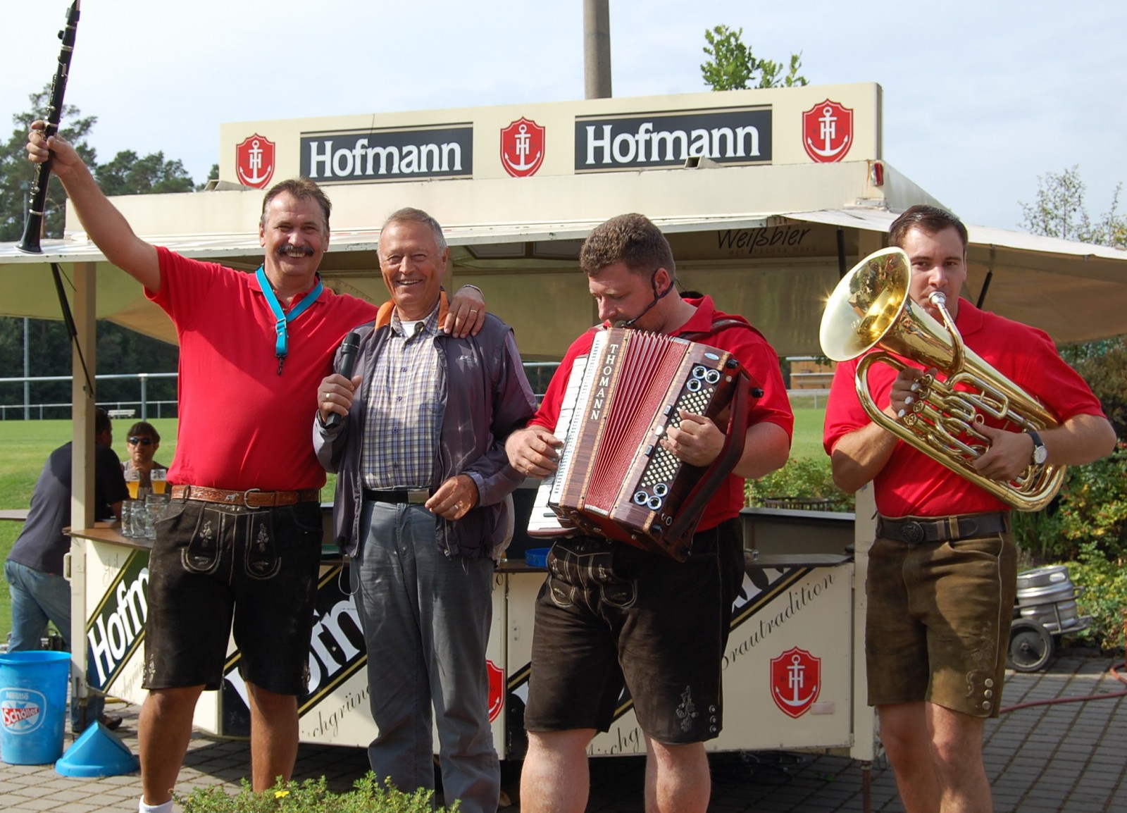 Bei strahlendem Spätsommerwetter hatten sich zahlreiche Besucher eingefunden, die zu Fuß, mit dem Bürgerbus aber auch mit dem Fahrrad unterwegs waren. Brotzeit und warmes Essen war in reichlicher Anzahl vorhanden und wurde wie die Getränke von den fleißigen Bedienungen – alle in Tracht –serviert. Unsere Hausband mit Olli, Manfred und Richi, bekannt als die Gruppe „Allmächd“, heizten bis in den späten Nachmittag ein und brachten den Biergarten mehrere Male „ zum Kochen“. Altbürgermeister Fischer trat wie gewohnt als „Bänkelsänger“ auf, Bürgermeister Habel war mit einer Abordnung der Langenzenner Stadtverwaltung zum Mittagessen erschienen und auch Brauereichef Hofmann stattete dem Frühschoppen eine Besuch ab. Alle hatten ihren Spaß und mancher fand erst sehr spät seinen Heimweg. Ein Sonderlob ist allen Servicekräften auszusprechen. Was hier Küche, Ausschank und Bedienungen am Kärwawochend leisteten, hält jederzeit einen Vergleich zu einer „ richtigen“ Wirtschaft statt und hat den Sportfreunden wieder viel Lob von allen Seiten eingebracht.