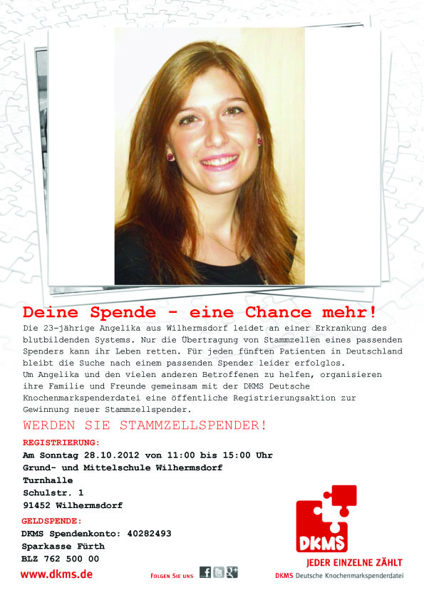 Gewinnung neuer Stammzellspender. Auch Wir als Sport und Sängerfreunde Laubendorf können hier gemeinsam helfen. Alle Informationen über die Typisierungsaktion und mehr Details zur DKMS finden Sie auf unser homepage unter downloads oder direkt hier. Nutzen Sie bitte auch die Flugblätter um für die Typisierungsaktion im Freundes-, und Bekanntenkreiszu werben. Danke für Eure Unterstützung ! Flugblatt Typisierungsaktion für Angelika Meier DKMS Flugblatt Stammzellenspende Deine Spende – eine Chance mehr! REGISTRIERUNG: