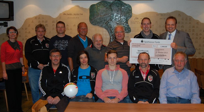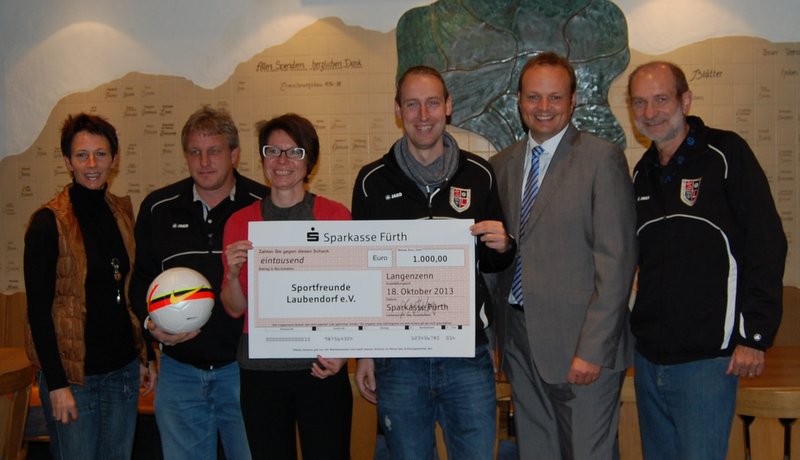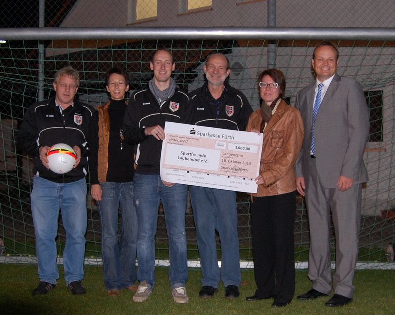 Die Sportfreunde Laubendorf nahmen die abendliche Übergabe einer Spende der Sparkasse Fürth zum Anlass um sich bei allen Helfern dieser Maßnahme zu bedanken. Dabei konnte man sich bei bestem Flutlicht von der einige Tausend Euro teuren Investition überzeugen. Die neue Anlage leuchtet den alten B-Platz flächendeckend aus, so dass jetzt zur Winterzeit neben dem Trainingsbetrieb auch Punktspiele auf Kleinfeld möglich sind. Dazu wurden zwei neue Stahlmasten in vorgefertigte Fundamente eingesetzt, während die anderen neuen Lampen an der Rückseite vorhandener Masten für den C-Platz befestigt wurden.Vorstand Christian Gall bedankte sich in Anwesenheit seines Stellvertreters Michael Jakob und Vereinskassiererin Simone Gattinger bei den anwesenden Helfern, die durch ihren Einsatz die Kosten im Rahmen gehalten hatten. Ein besonderer Dank galt der Sparkasse Fürth, die diese Maßnahme mit einer Spende von 1000 ¤ unterstützt. Manfred Durlak hatte bei Jochen Hollweck, dem Geschäftsstellenleiter der Sparkasse in Langenzenn, ein „offenes Ohr“ gefunden, als er ihm über diese dringend notwendige Baumaßnahme „seiner“ Sportfreunde berichtet hatte. Der Energieverbrauch dieser alten Flutlichtlampen war enorm und im Zeichen der Energiewende keinesfalls mehr zeitgemäß. Jochen Hollweck brachte zur Übergabe nicht nur seine Kollegin Melanie Glück, ihres Zeichens Marktbereichsleiterin, mit, sondern spendierte den Sportfreunden dazu einen besonderen Spielball, der auch ohne Flutlicht gut wahrgenommen werden kann und hoffentlich oft im Tor des Gegners landet.Bei einem Imbiss im Sportheim konnten sich die Beteiligten austauschen und den Gästen Wissenswertes über den Verein auf den Nachhauseweg mitgeben. Es ist auch weiterhin für die Sportfreunde wichtig, Kontakt zu Firmen und Institutionen zu halten, um dadurch Unterstützung für nötige Anschaffungen zu erhalten.