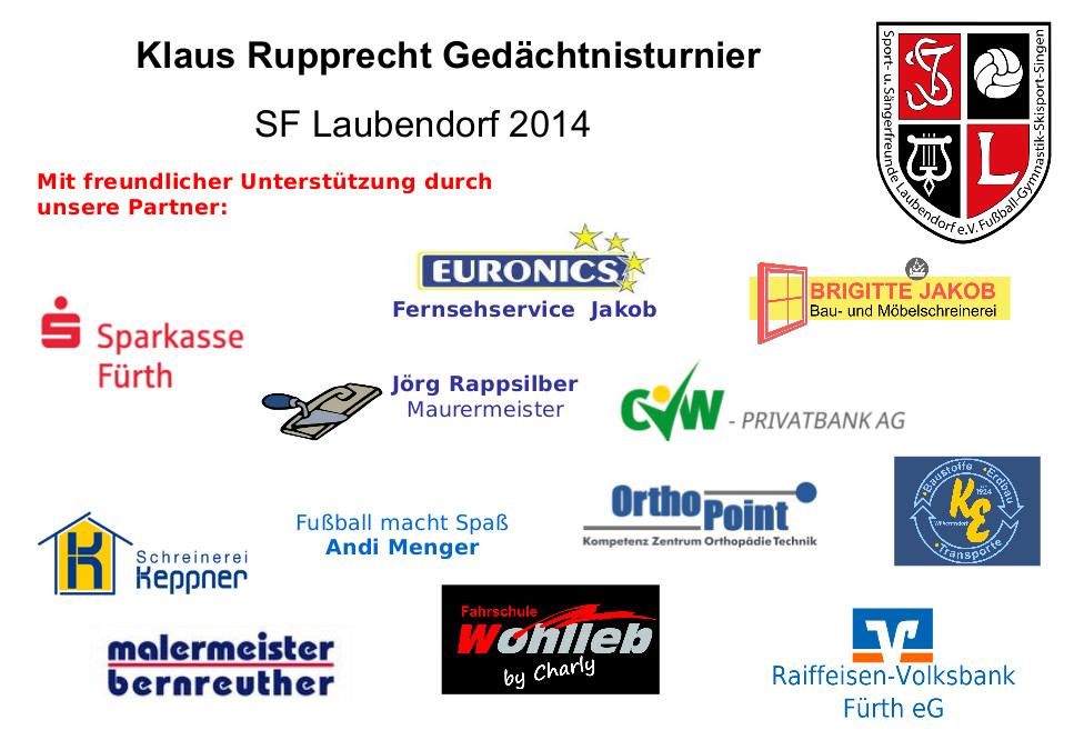 Genaue Spielpläne können unter “Feste & Termine” zu finden.Die Sport- und Sängerfreunde Laubendorf wünschen allen Aktiven und Zuschauern faire und verletzungsfreie Spiele. Viel Spaß beim Klaus Rupprecht Gedächtnisturnier 2014 !