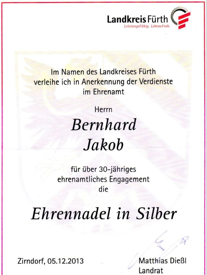 Bernhard Jakob war von 1970-2002 in der Vorstandschaft des SFL tätig. Zunächst war er Schriftführer, danach Leiter der Fußballabteilung und von 1981-1999 war er 18 Jahre lang 1. Vorsitzender des Vereins. Aber auch jetzt ist Bernhard nicht wegzudenken, so kümmert er sich um “fast” alles im und ums Sportheim, und unterstützt unsere beiden Platzwarte. Deshalb möchten auch wir es nicht versäumen, nochmals unseren Dank an die Bernhard auszusprechen. Wir hoffen natürlich, dass du uns weiterhin mit Rat und Tat zur Seite stehst um unseren SFL auch in Zukunft zu einem “besonderen” Verein zu erhalten.Auch wurde unser Mitglied Maximilian Wallmüller, von Landrat Diesel geehrt. Maxi ist seit 2011 des jüngste Feuerwehr Kommandant im Landkreis Fürth. Aus diesem Grund wurde Maxi als “Junger Held” geehrt.Auch dir Maxi möchten wir auf diesem Weg nochmals unsere Glückwünsche überbringen.Sport- und Sängerfreunde LaubendorfVorstandschaft